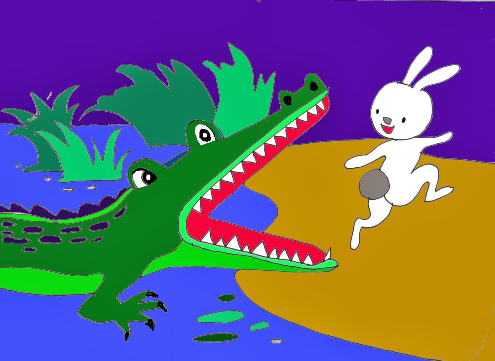 Nghe Thỏ nói thế, Cá Sấu liền há to mồm kêu lên “Ha ! Ha !” Thỏ nhảy phốc khỏi miệng Cá Sấu rồi quay lại cười nhạo và chạy biến vào rừng.