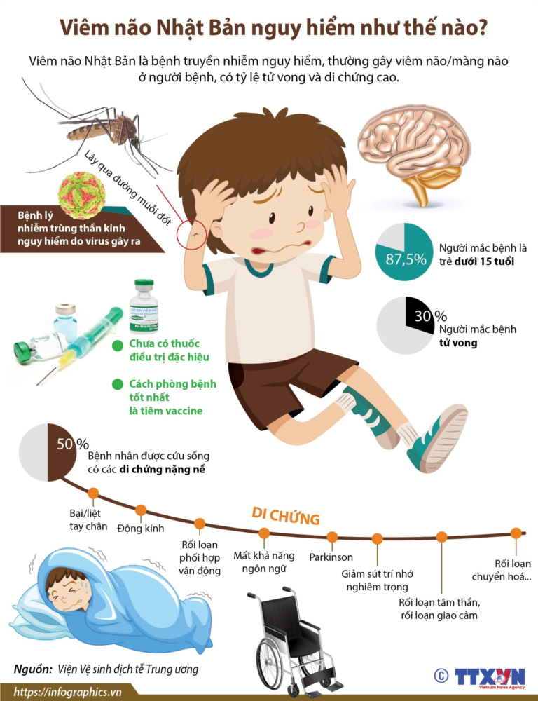 - TS Nguyễn Văn Lâm, Trưởng khoa Truyền nhiễm, BV Nhi TƯ cho biết, ước tính, khoảng 25 - 35% bệnh nhân viêm não Nhật Bản tử vong và khoảng 50% bệnh nhân có di chứng thần kinh, tâm thần.